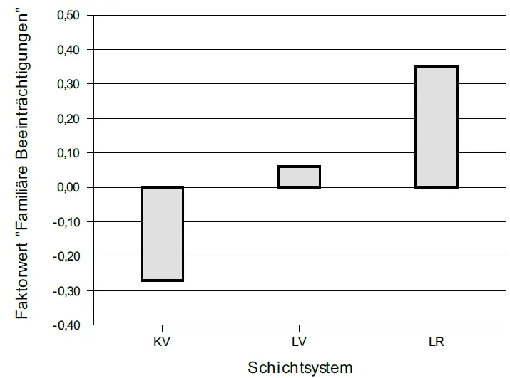 Familiäre Beziehungen wurden z.B. durch das kurz vorwärts rotierte System (KV) deutlich weniger beeinträchtigt, als durch die lang rotierten Systeme (LV = lang vorwärts, LR = lang rückwärts; hohe Werte entsprechen hohen Beeinträchtigungen):