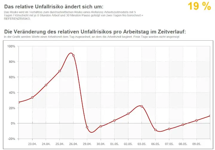 In diesem Beispiel kumuliert sich das Unfallrisiko in der Woche mit 5 Nachtschichten: